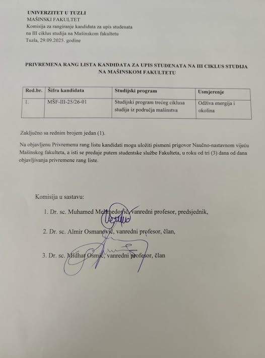 Privremena rang lista kandidata za upis na III ciklus studija u akademskoj 2025/2026. godini