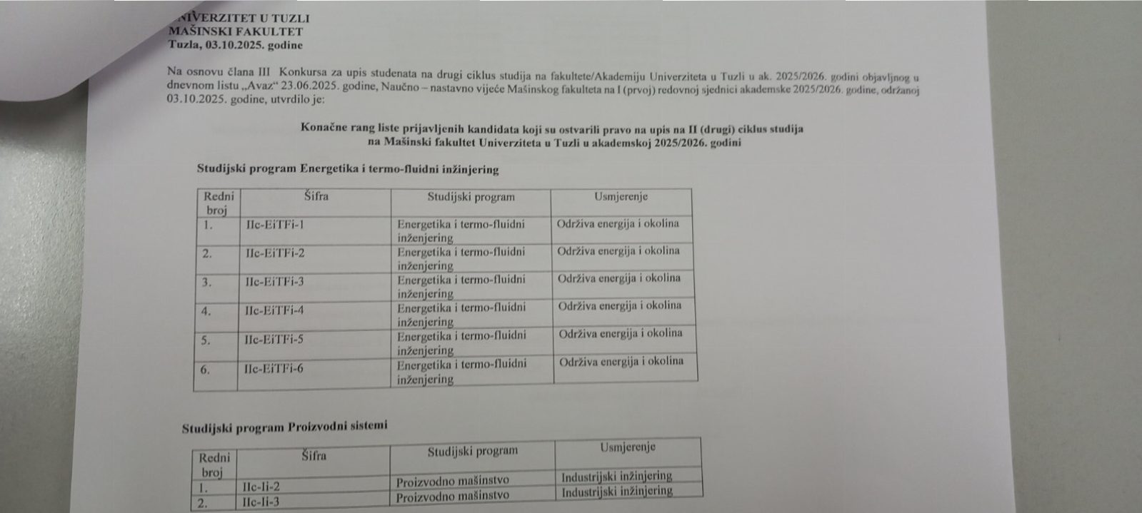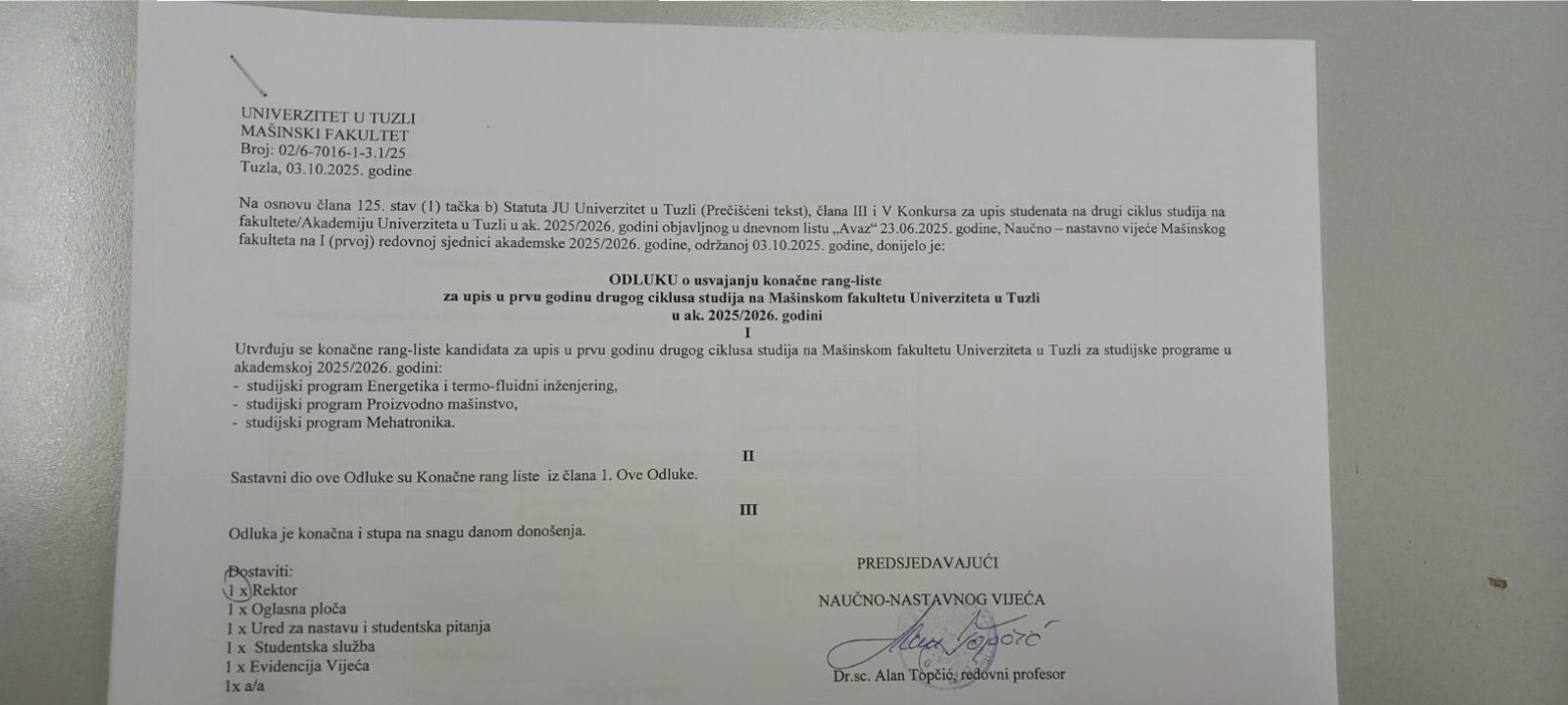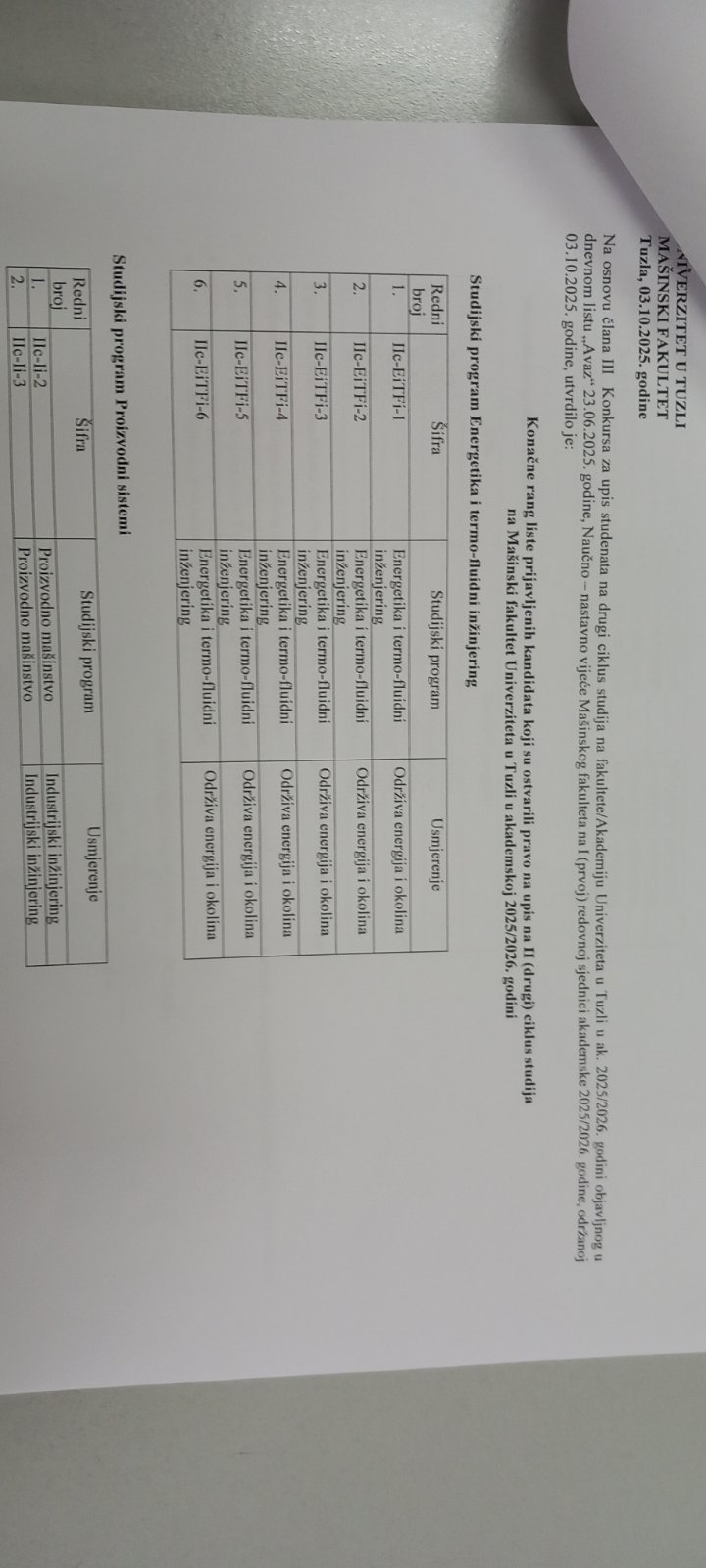 Konačna rang lista kandidata za upis na II ciklus studija u akademskoj 2025/2026. godini