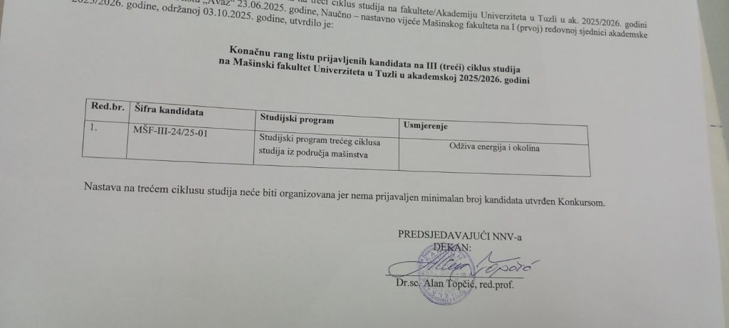 Konačna rang lista kandidata za upis na III ciklus studija u akademskoj 2025/2026. godini