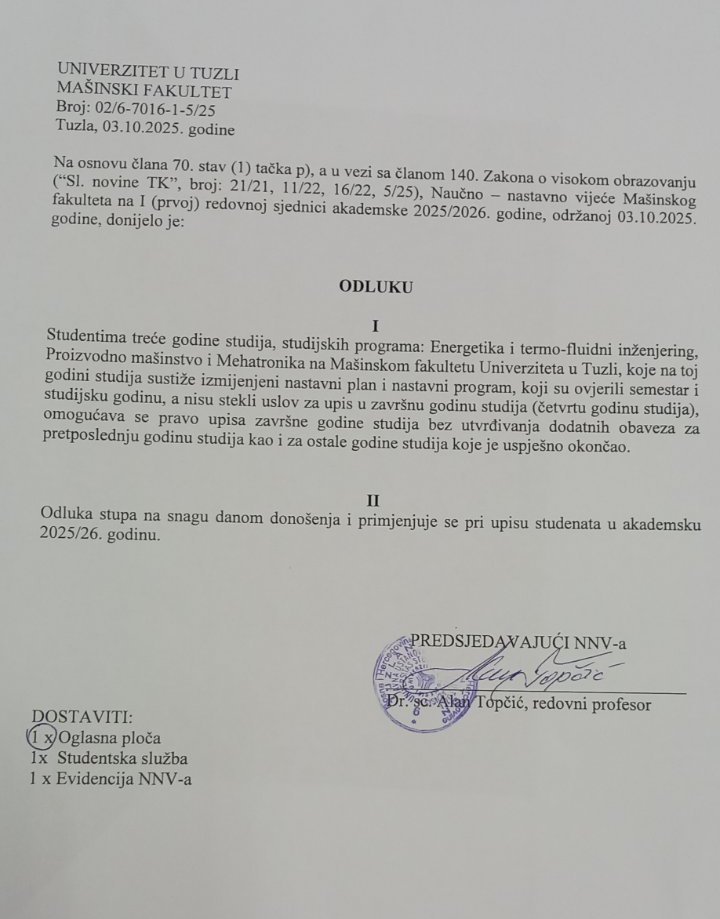 ODLUKA – za studente treće godine studija koji obnavljaju pretposljednju godinu studija